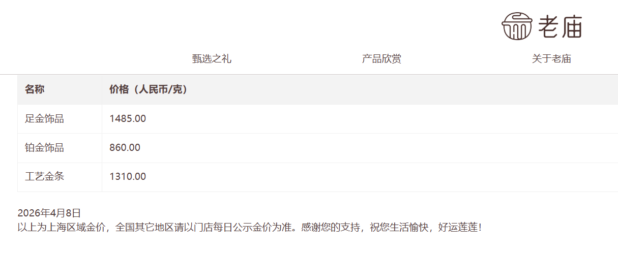 受此影响,国内品牌金饰价格继续上调。中新经纬8日查询发现,老庙黄金足金饰品报1485元/克,单日涨49元;周生生足金饰品报1471元/克,单日涨37元;老凤祥足金饰品报1470元/克,单日涨35元。
