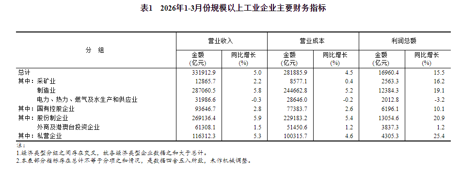1—3月份,全国规模以上工业企业实现利润总额16960.4亿元,同比增长15.5%(按可比口径计算,详见附注二)。
