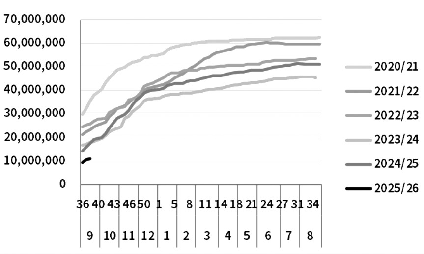 图为美豆本年度累计出口销售量(单位:吨)