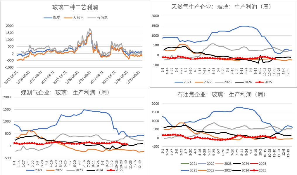 从利润来看玻璃生产端,除了天然气工艺依旧亏钱外,煤制气和石油焦工艺也在小幅盈利阶段,利润相对平稳,目前利润下玻璃厂生产偏稳定运行,冷修可能性偏低,这为玻璃期货市场提供了一定的支撑。