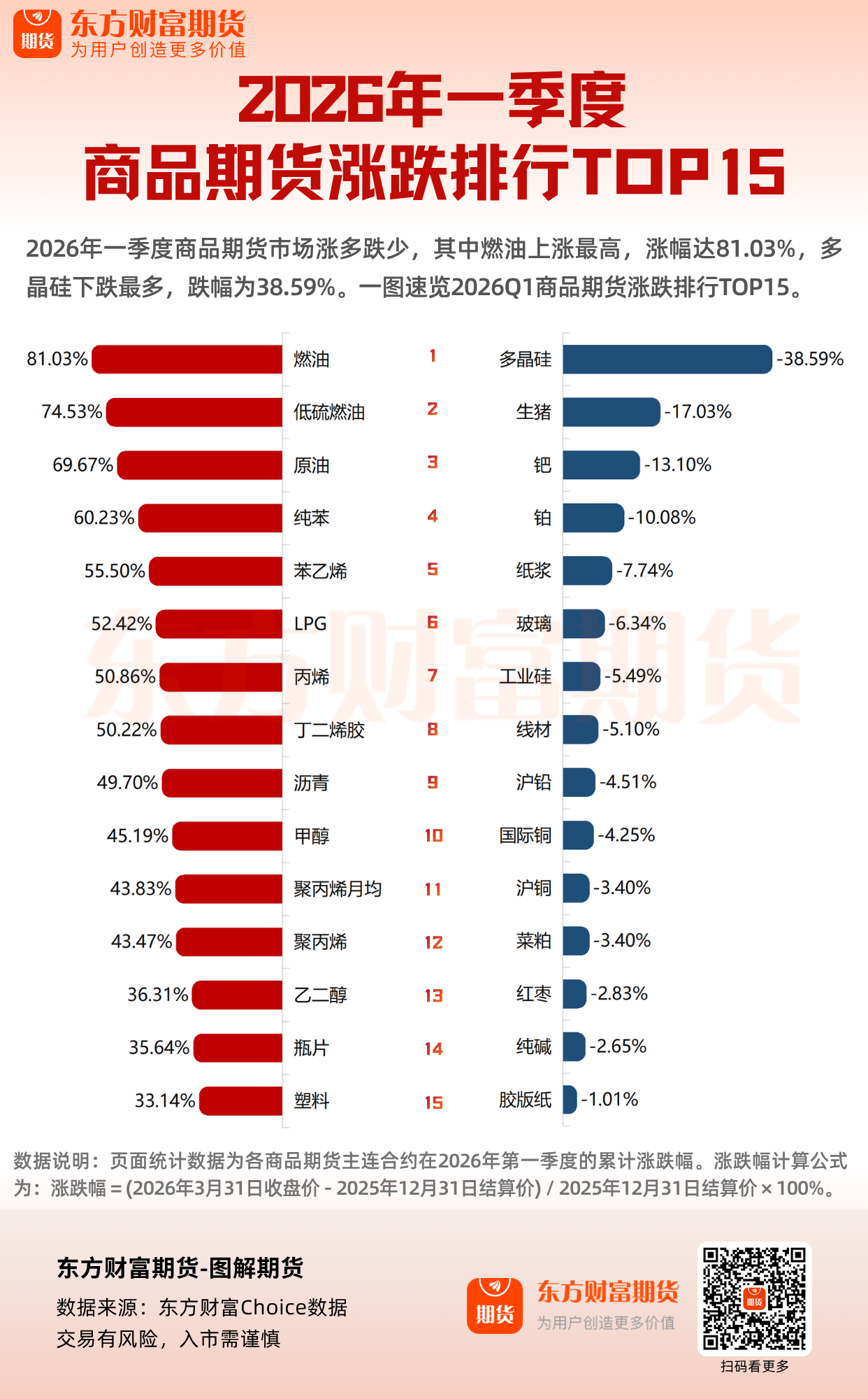 2026年一季度商品期货市场涨多跌少,其中燃油上涨最高,涨幅达81.03%,多晶硅下跌最多,跌幅为38.59%。一图速览2026Q1商品期货涨跌排行TOP15。