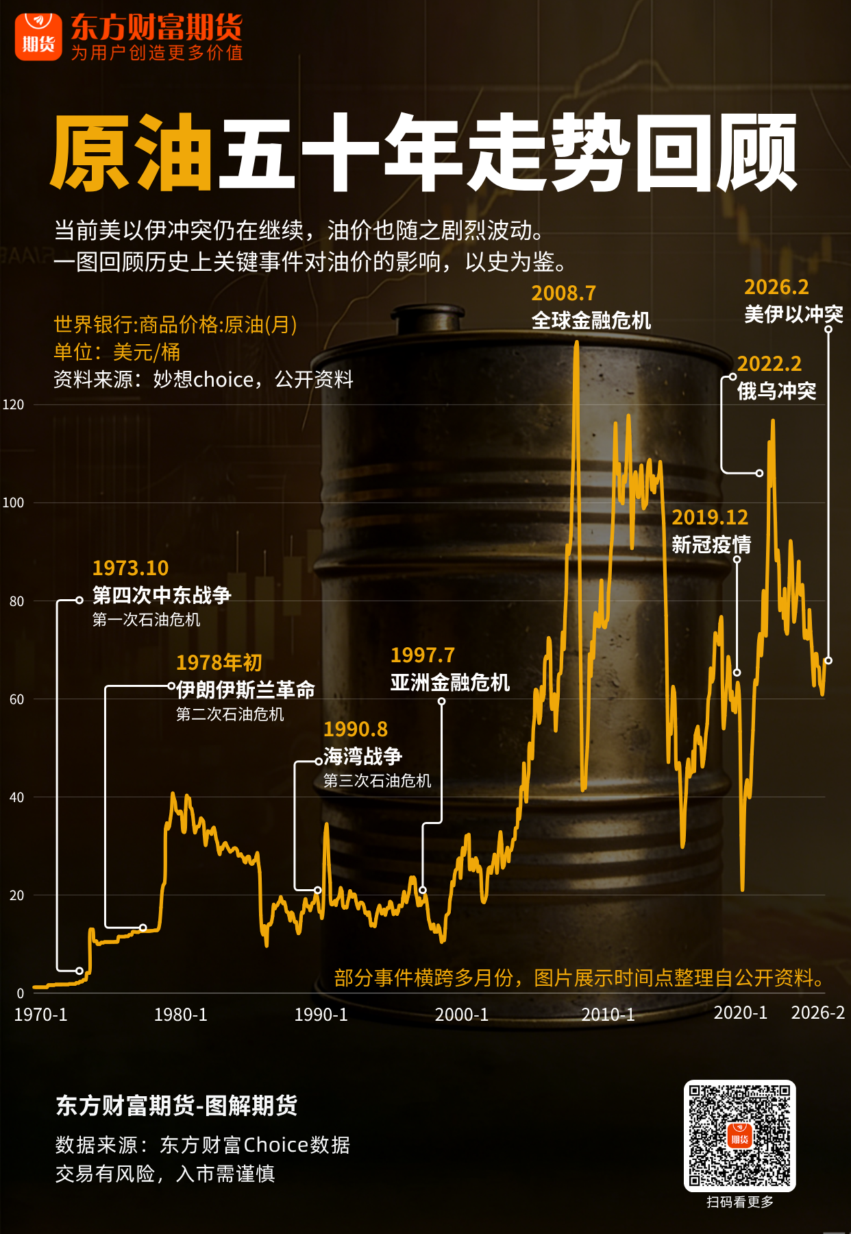 当前美以伊冲突仍在继续,油价也随之剧烈波动。一图回顾历史上关键事件对油价的影响,以史为鉴。