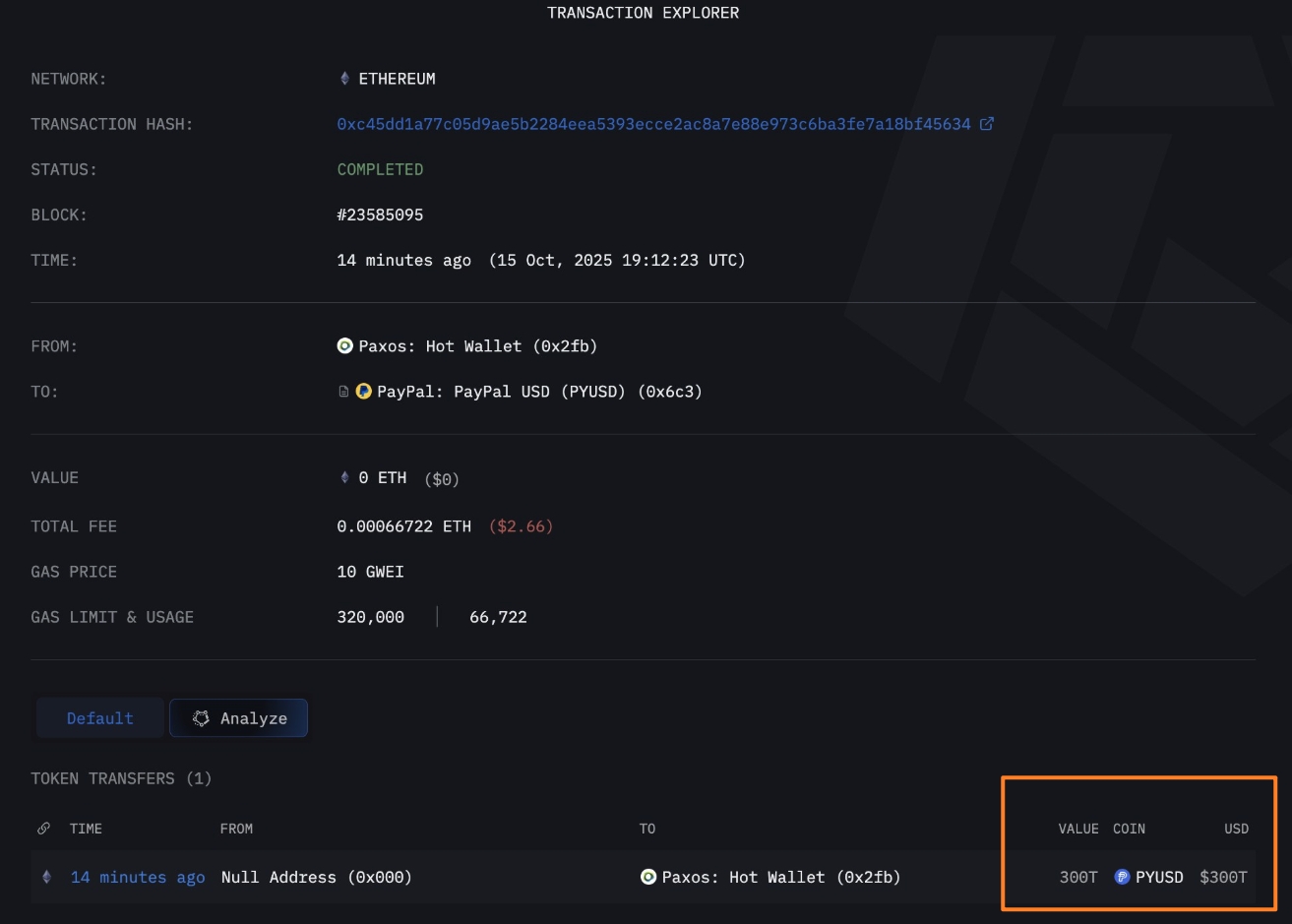 交易记录显示,Paxos随后按照常规操作铸造了3亿枚PYUSD。所以这起事件的全貌并不难猜:Paxos将3亿(300 million)错误打成了300万亿(300 trillion)。