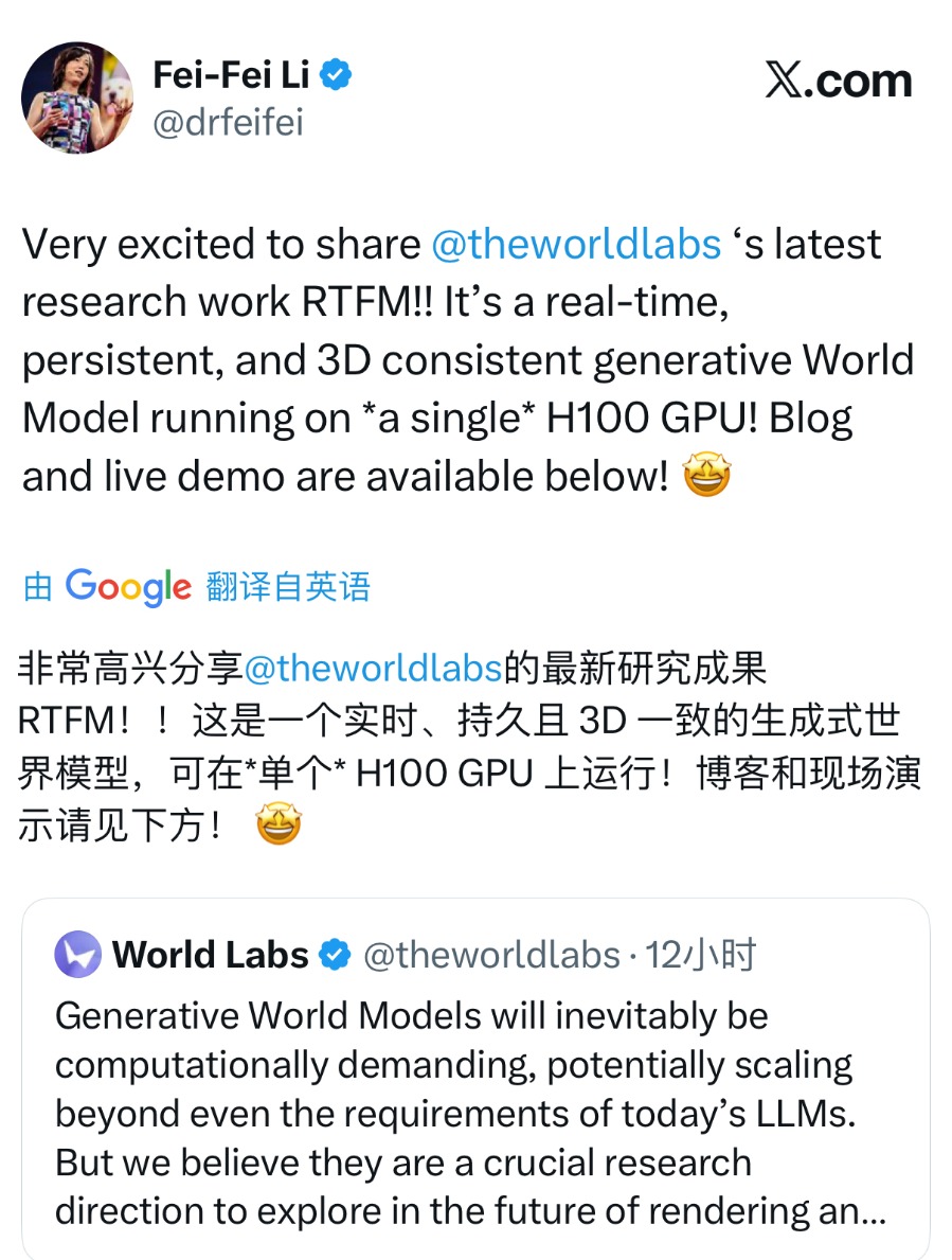 AI教母、斯坦福大学教授李飞飞的创业公司 World Labs 又上新了。当地时间10月16日,李飞飞转发推文介绍全新实时生成式世界模型RTFM(Real-Time Frame Model),称这是一个实时、持续运行且保持3D一致性的生成式世界模型,亮点是可在单个H100 GPU上高效运行,这一突破在AI生成模型领域具有里程碑意义。