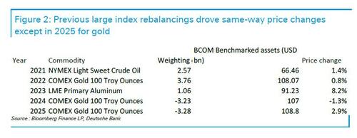 德银发现,在2021年至2024年期间,显著的权重变化均与具体的商品价格走势呈现正相关。只有去年是一个例外,黄金权重的下调却伴随着金价的上涨。