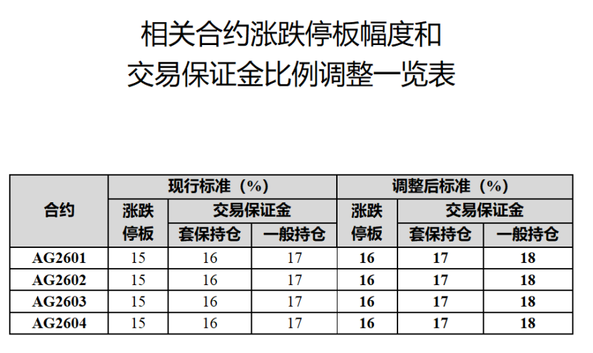 二是上调白银期货交易保证金比例和涨跌停板幅度。根据最新公告,从1月9日(星期五)收盘结算时起,白银期货AG2601、AG2602、AG2603、AG2604等4个合约的涨跌停板幅度调整为16%,较此前再上调1个百分点;套保持仓交易保证金比例调整为17%,一般持仓交易保证金比例调整为18%,同样也是上调了1个百分点。