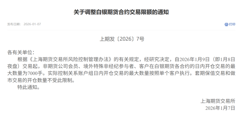 三是下调白银期货交易限额。比调板来得更快的是交易限额调整,上期所宣布,从1月9日(即今日夜盘)交易起,非期货公司会员、境外特殊非经纪参与者、客户在白银期货各合约的日内开仓交易的最大数量为7000手。实际控制关系账户组日内开仓交易的最大数量按照单个客户执行。套期保值交易和做市交易的开仓数量不受此限制。