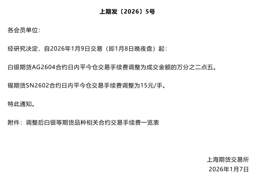 四是调整白银、锡品种交易手续费。同时,上期所还宣布,同样从今天夜盘开始,白银期货AG2604合约日内平今仓交易手续费调整为成交金额的万分之二点五;锡期货SN2602合约日内平今仓交易手续费调整为15元/手。