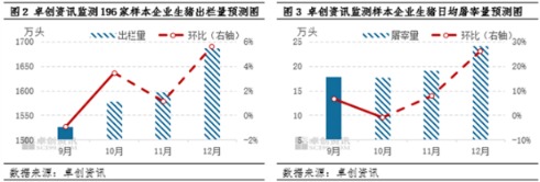 从屠宰量来看,由于供应充足,部分区域白条走货情况亦陆续好转,因此10月份屠宰量降幅或较预期收窄,与9月平均水平较为接近。而进入11月份后,受天气转冷、腌腊备货等因素的影响,屠宰量或开始增加,并于12月份出现高峰,根据往年历史周期规律及今年情况综合判断,预计12月份样本企业日均屠宰量环比增加幅度或达到26.18%。