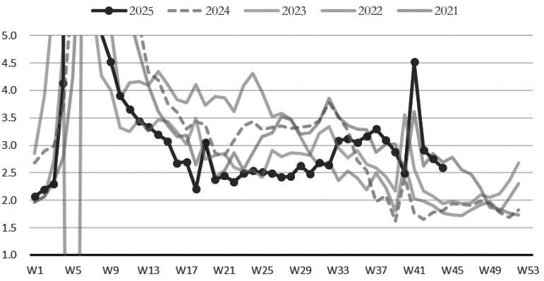 此外,螺纹钢库存近期虽迎来去化,但降幅有限,仍是近年来同期高位。同口径下螺纹钢库存总量为602.52万吨,近三周降库也仅是消耗长假假期增幅,环比微增0.27万吨。同时,当前库存水平为近年来同期高位,较去年同期增165.24万吨,增幅为37.79%;库消比为2.595,同比增幅为42.82%,库存压力偏大。目前来看,旺季建筑钢厂生产趋稳,螺纹钢产量低位回升,供应有所增加,产业矛盾缓解有限,相对利好则是多数地区螺纹钢品种吨钢利润不佳,生产积极性或趋弱,供应增量会受限,但因库存水平偏高,压力并未消退。