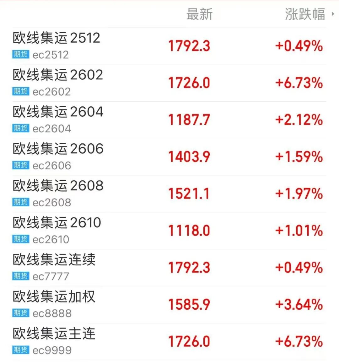 昨日,集运指数(欧线)期货(下称集运指数)表现偏强,主力2602合约收盘大涨6.73%。