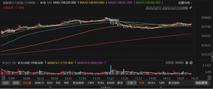 今日碳酸锂期货主力合约全天走势强劲,呈现宽幅震荡与单边拉升的显著特征。Choice数据显示,合约早间以101500元/吨开盘后持续上行,盘中最高触及109860元/吨,日内波动显著。截至发稿,合约报价108260元/吨,较开盘价上涨6760元,涨幅达6.66%。