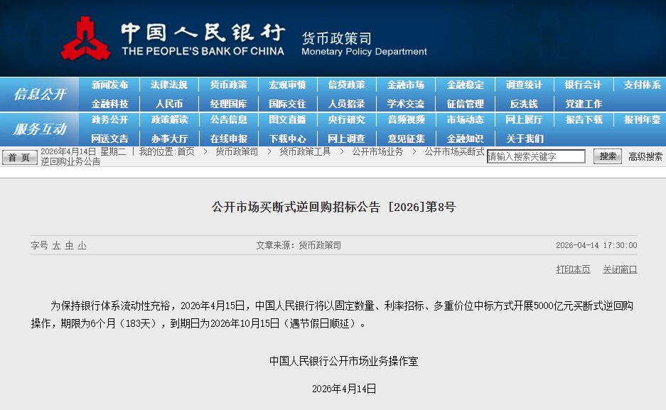 央行:4月15日将开展5000亿元买断式逆回购操作.