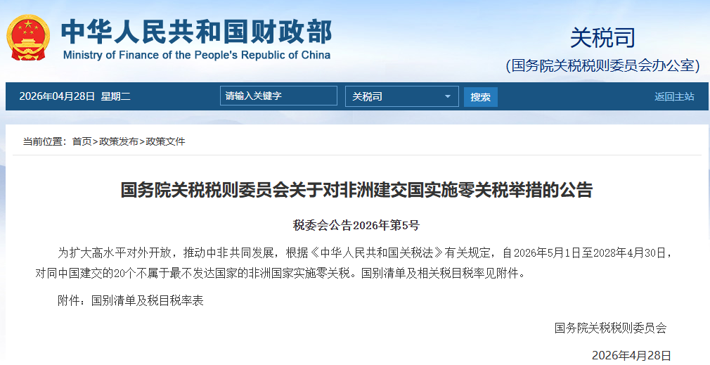 我国自2026年5月1日起对所有非洲建交国实施零关税.