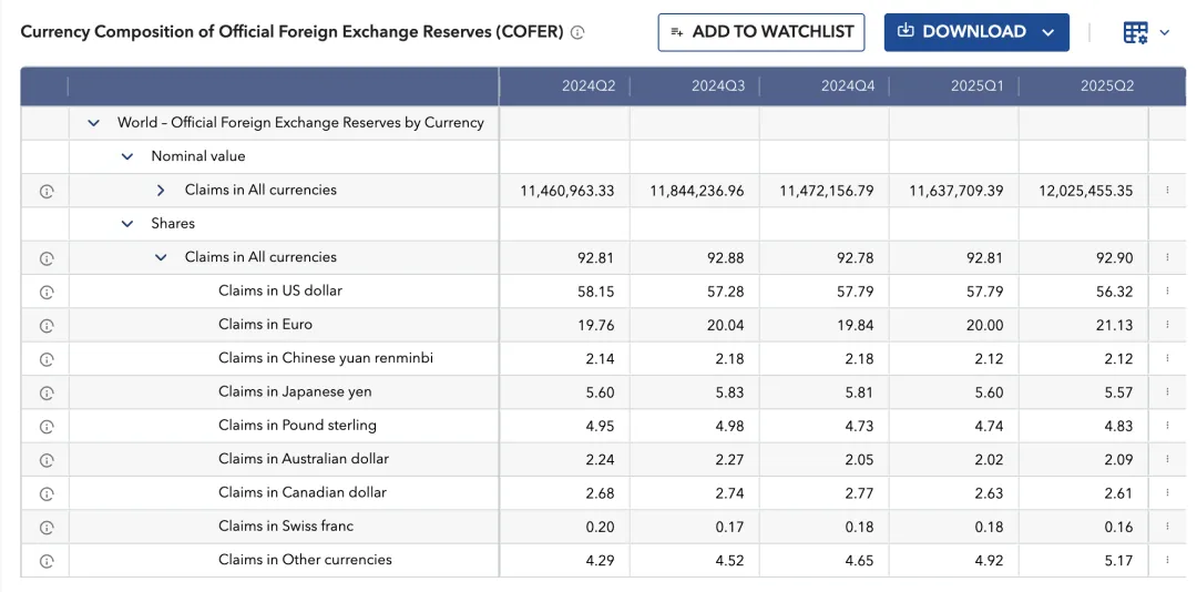 从欧元表现看,IMF认为,在某些情形下,货币升值能够抵消其在全球央行储备中整体持有量的下降。比如,尽管今年第二季度欧元在全球央行官方储备中总持有量下滑,但其占比仍升至超21%,创下2021年以来新高。这与欧元在二季度显著升值有关。在美元持续走弱背景下,欧元成为全球外汇储备中重要的替代选项。