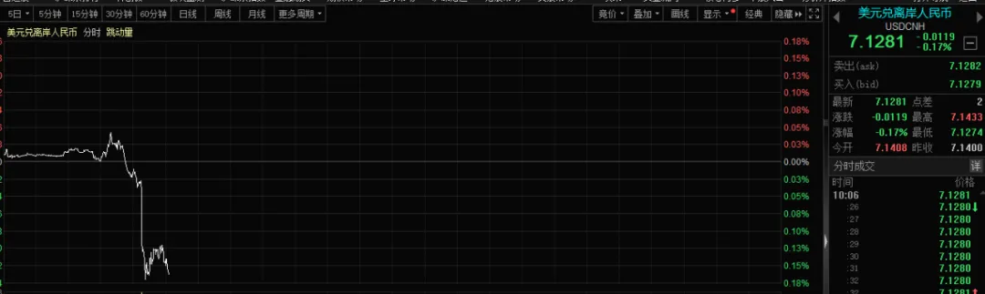 10月15日早上,人民币兑美元中间价报7.0995,上调26点;上一交易日中间价7.1021,上一交易日官方收盘价7.1411,上日夜盘报收7.1380。受此提振,离岸人民币兑美元直线拉升超100点,人民币汇率短期波动显著。