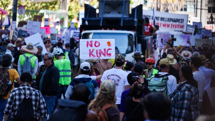 组织者称,此次“不要国王”抗议正凝聚所有反对力量。参议院少数党领袖查克·舒默等民主党高层,以及独立参议员伯尼·桑德斯均参与其中。在组织者看来,这一活动是对特朗普政府的反击。6月14日,美国各地爆发约2000场示威游行,抗议活动以“不要国王”为名,反对特朗普政府移民、卫生、教育、立法等方面政策,共计数百万人参加。(文章来源:上观新闻)