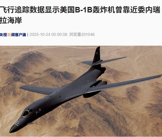 据央视新闻,当地时间10月23日,总台记者获悉,根据飞行追踪数据显示,当日至少有一架美国B-1B轰炸机靠近委内瑞拉沿岸。这是美国军机一周内第二次进行此类军事威慑。军事专家指出,此类行动加剧地区紧张局势,可能引发不可控后果。